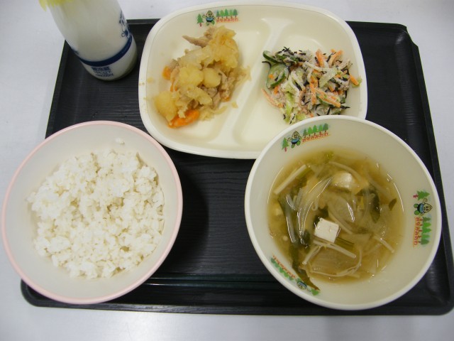 【献立】ごはん 牛乳 もやしの味噌汁 肉じゃが ひじきマヨサラダ
