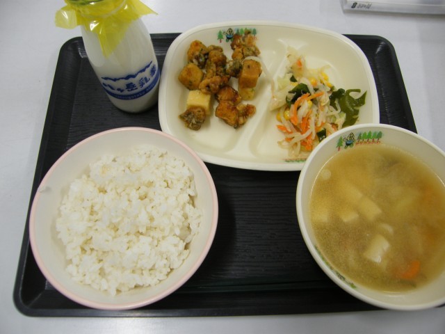 【献立】ごはん 牛乳 みそけんちん汁 ホキと凍り豆腐の香味揚げ 海藻サラダ