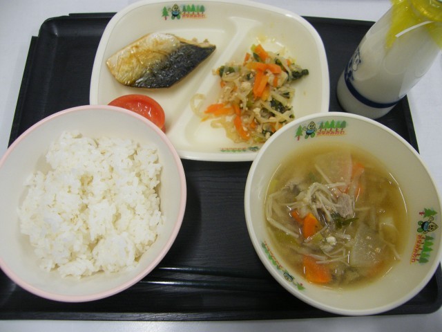【献立】ごはん 牛乳 きのこ豚汁 さばの塩焼き 切り干し大根の煮物 トマト