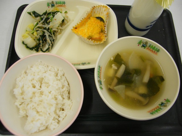 【献立】ごはん 牛乳 五色汁 鮭のにんじんマヨ焼き おひたし
