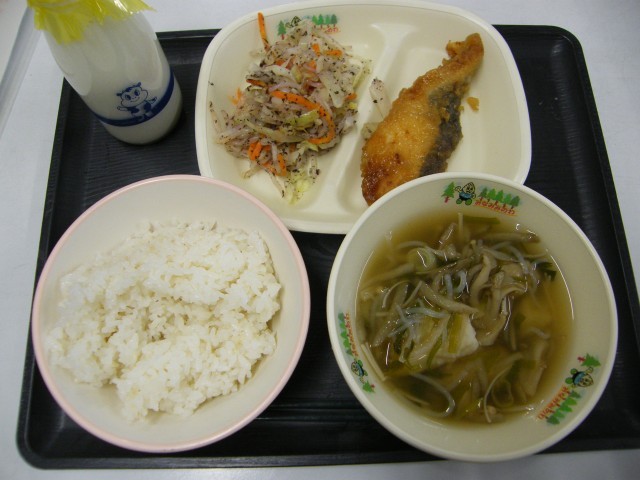 【献立】ごはん 牛乳 きりぱんぽ汁 たらのたまねぎソース ゆかり和え