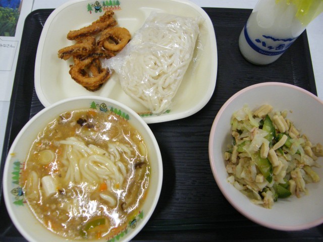 【献立】ソフト麺 牛乳 マーボー麺の汁 いかリング揚げ 凍り豆腐とツナのごま和え