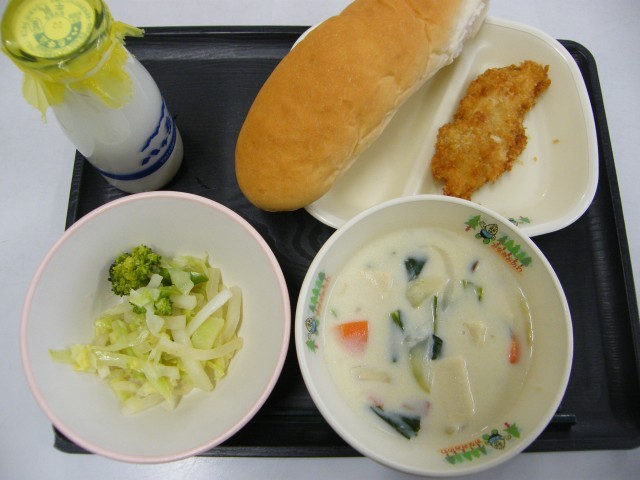 【献立】コッペパン 牛乳 凍り豆腐のチャウダー たらのフライ レモンあえ