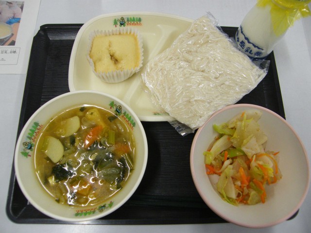 【献立】ソフト麺 牛乳 カレー南蛮汁 カップ肉まん 浅漬け