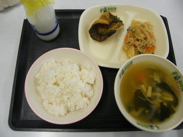 【献立】ごはん 牛乳 わかめスープ にじますの円揚げ じゃがいもと切り干し大根の煮物