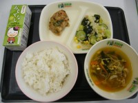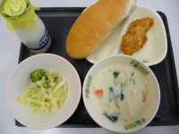 【献立】抹茶きなこ揚げパン 牛乳 ポテトのチーズ焼き みずなとしらすのサラダ とりだんごスープ