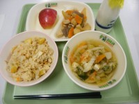 10月24日(金)の給食【献立】吹き寄せごはん 牛乳 すまし汁 五目煮 りんご(...