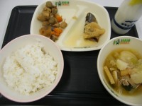 10月15日(水)の給食【献立】ごはん 牛乳 きのこ豚汁 まさご焼き 大豆とひじ...