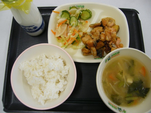 12月16日(火)の給食【献立】ごはん 根菜のごま汁 鮭とレンコンの甘酢あん ゆ...
